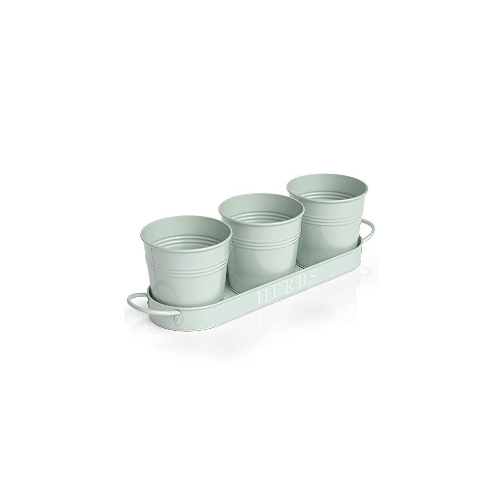 Barnyard Designs Herb Pot Planter Set with Tray for Indoor Garden or Outdoor Use, Soft Mint Metal Succulent Potted Planters, (Set of 3, 11 x 10cm Planters on 32 x 10cm Tray)