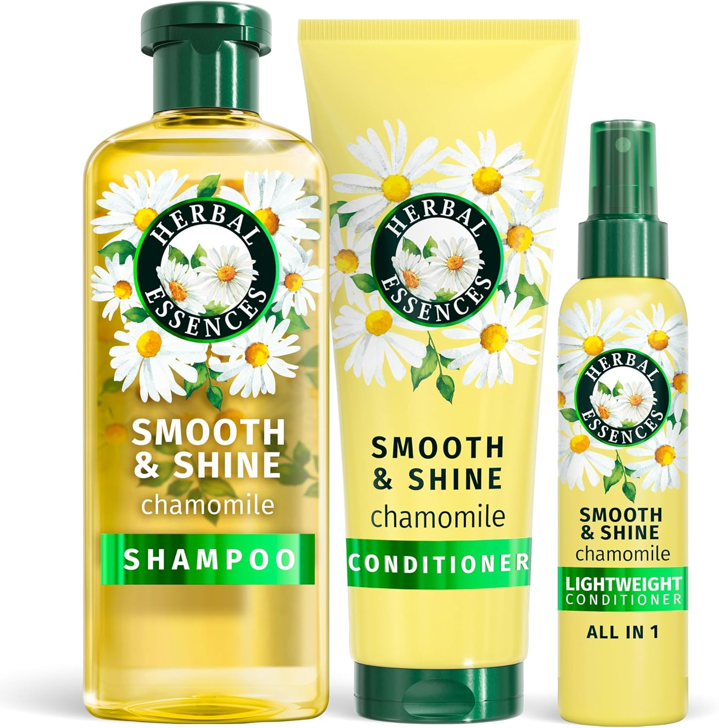Herbal Essences Smooth & Shine Chamomile Set: Shampoo + Conditioner + Lightweight Leave-in Conditioner Spray All in One | Detangle, Nourish, Tame Frizz, Repair, Add Shine & Lasting Scent