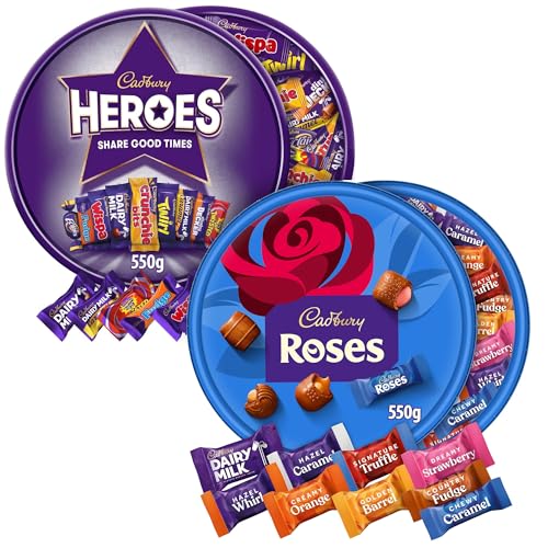 Cadbury Christmas Gifting Bundle, Includes 550 g Tub of Chocolate Heroes & 500 g Tub of Chocolate Roses, Assorted Mini Chocolates