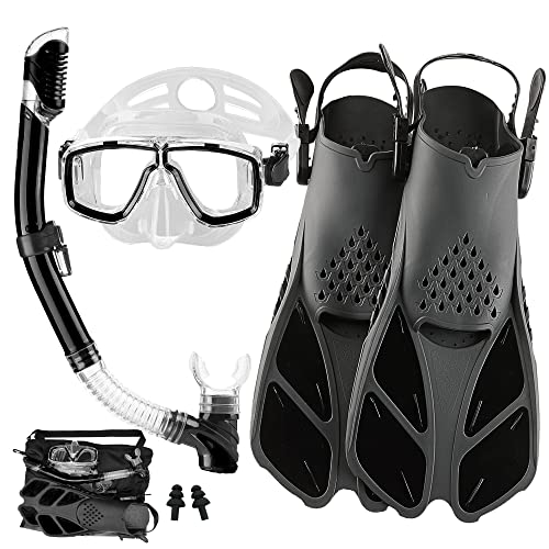 Adults Mask Snorkel Fins Set, Snorkeling Gear for Adult with Fins, Snorkel Sets with Flippers, Adult Anti Leak Scuba Gear with Adjustable Fins Diving Mask Full Dry Top Snorkel with Travel Bags