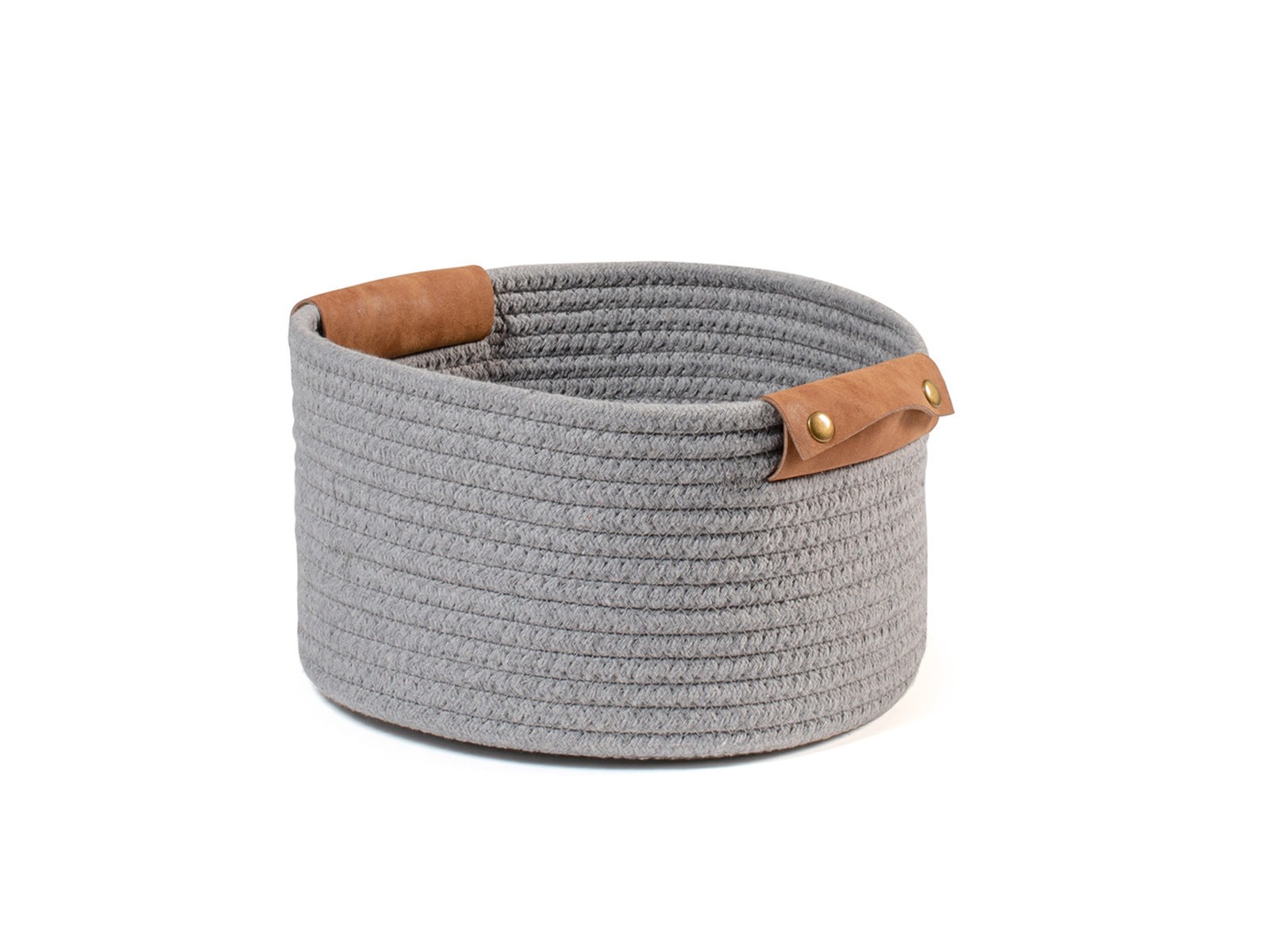 Round Gray Basket 26x15H cm, Handles In Faux Leather, Brand H&H