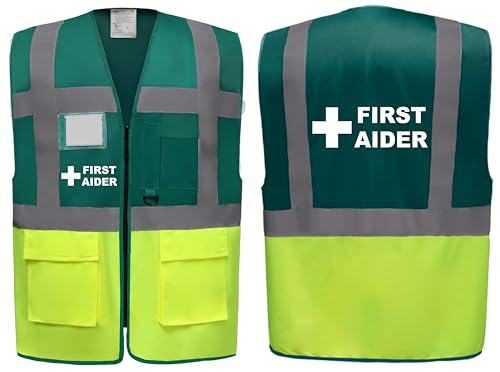 First Aider Superior Green/Yellow Hi Vis Zipped Safety Vest - High Visibility Waistcoat with Reflective Bands for Company Compliance First Aid & Medical Staff, Brook Hi Vis (Green/Yellow, XLarge)