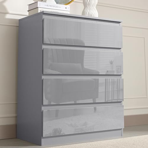 High Gloss Chest of Drawers, 4 Drawer Bedroom Chest of Drawers MDF Chest of Draws Bedside Table Storage Cabinet for Bedroom Living Room Office Hallway Furniture, Grey, 70W x 40D x 95.5Hcm