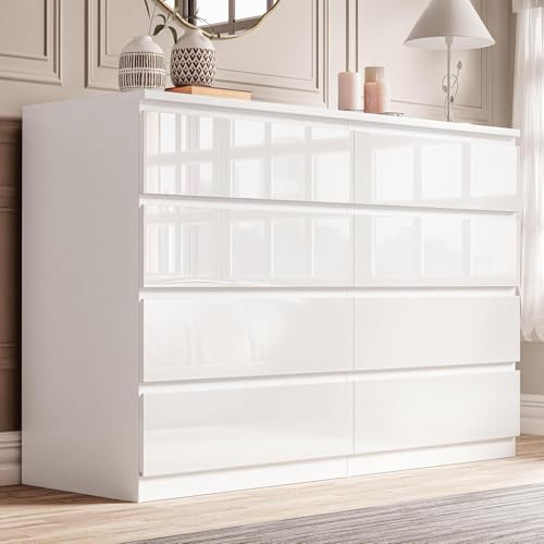 Blisswood High Gloss Chest of Drawers 8 Drawer Bedroom Large Storage Unit with Metal Runners, White Dresser cabinet for Clothes Living Room Bedroom Nursery or Office Furniture (40D x 115W x 97H cm)