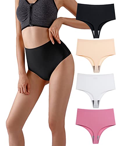 Wowdecor High Waisted Thongs for Women, Tummy Control Underwear Cotton Seamless No Show Plus Size Panties, 4 Pack Mix C, M