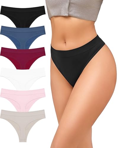 Telooco 6 Pack Seamless Thongs for Women V-neck High Waisted Thongs Stretchy Breathable Invisible Thong Sexy Underwear Panties Multipack (6 Colors, M)