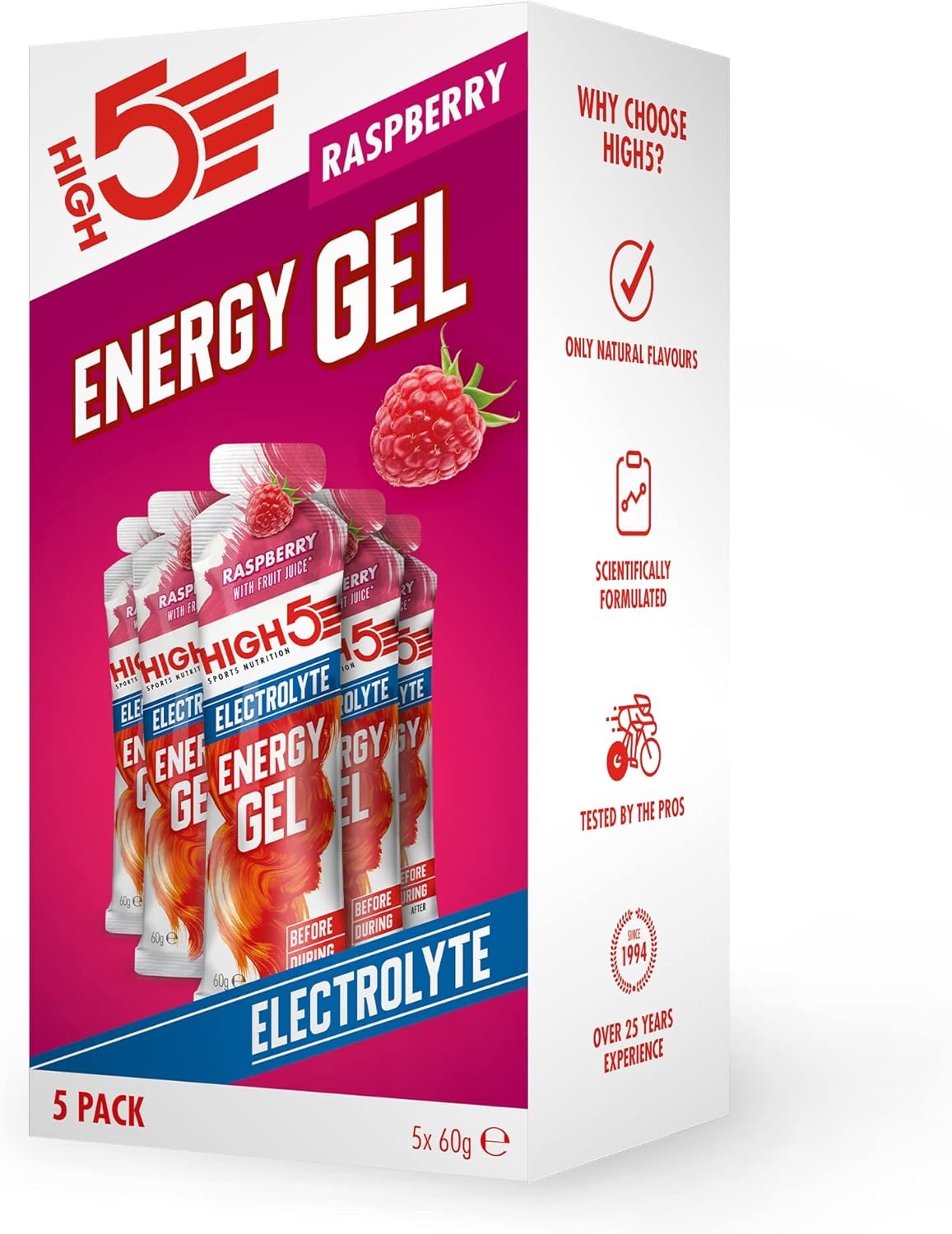 HIGH5 Energy Gels with Electrolytes - Quick Release Sports Gels for Peak Performance - Natural Fruit Juice & Caffeine-Free - Energy Boost for Running, Cycling, Endurance (Raspberry, 5 x 60g)
