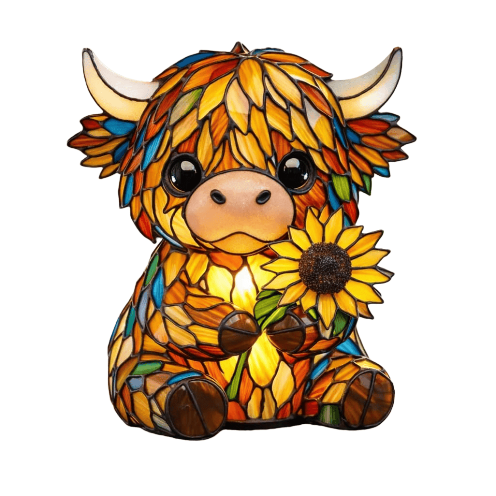 Handcrafted Sunflower Highland Cow Lamp, Stained Glass Table Light â Rustic Farmhouse Night Light for Living Room & Bedroom