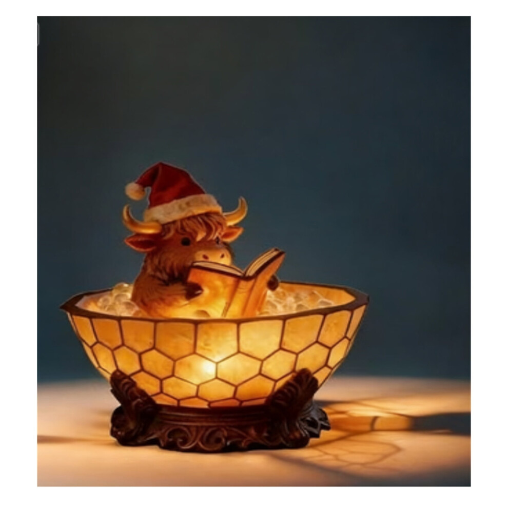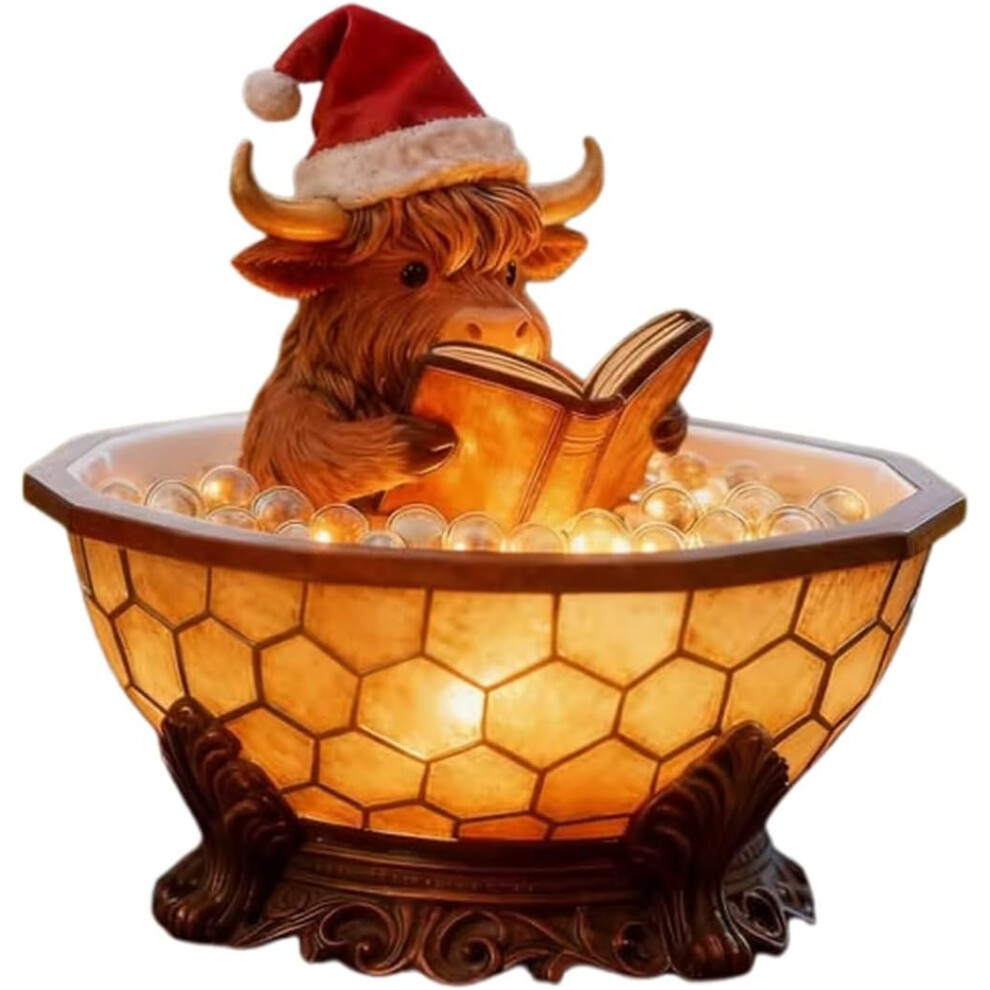 Christmas Highland Cow Reading Bubble Bath Night Light, 3D Animal LED Lamp, Festive Decor