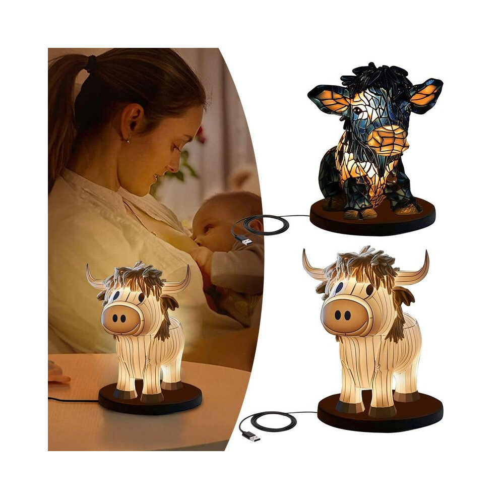 Highland Cow Table Lamp with USB Port â Portable Painted Cow Night Light for Living Room & Bedroom