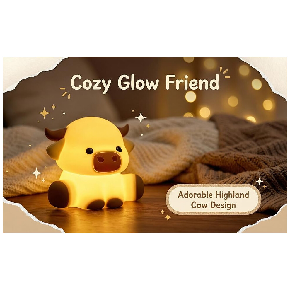 Cute Highland Cow Night Light for Kids, Squishy Silicone Nursery Lamp with Touch Sensor, USB Rechargeable Bedside Decor for Boys Girls (Warm Glow)