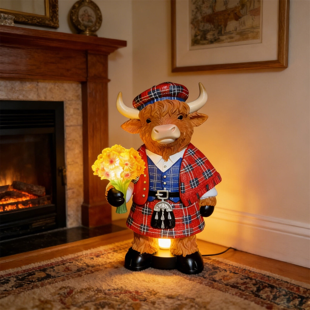 Highland Cow Table Lamp â 9.65" Plaid Kilt LED Flower Bouquet Lamp, Farmhouse Figurine Light for Living Room/Bedroom, Scottish Theme Decor