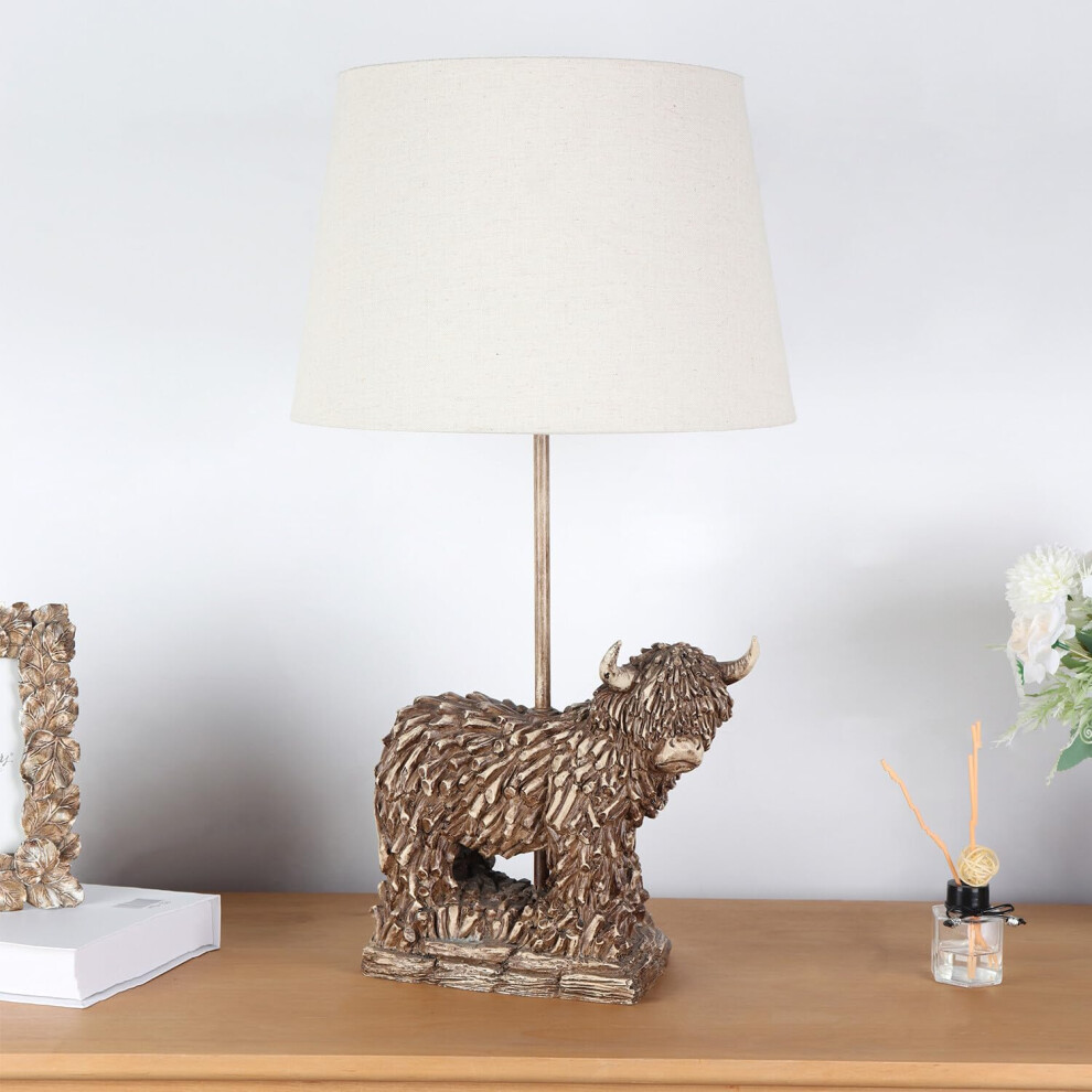 DEENZ Highland Cow Table Lamp Or Bedside Light with Oatmeal Linen Fabric Shade Resin Animal Led Compatible Home Decor