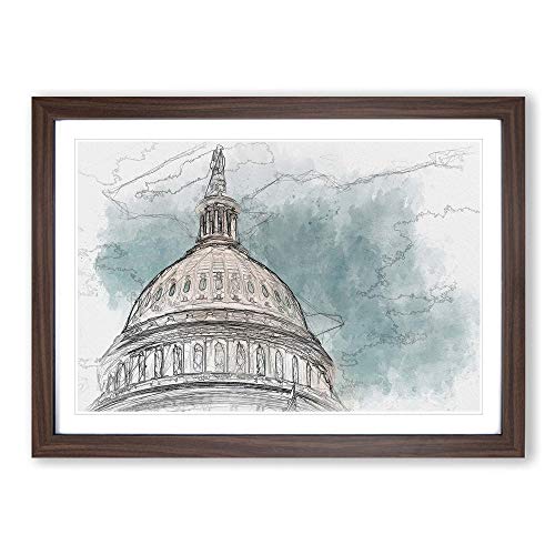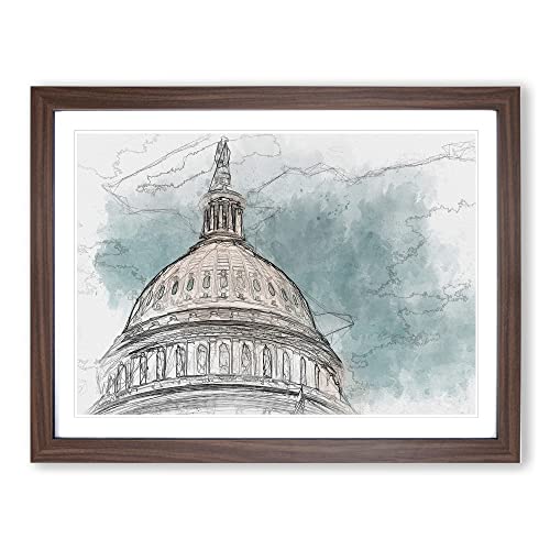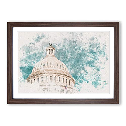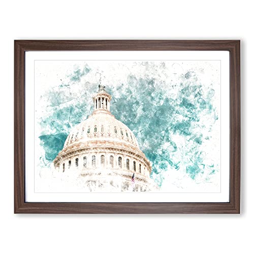 Capitol Hill White House Watercolour Modern Framed Wall Art Print, Ready to Hang Picture for Living Room Bedroom Home Office Décor, Walnut A4 (34 x 25 cm)