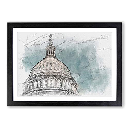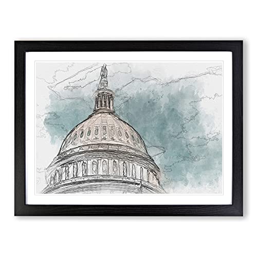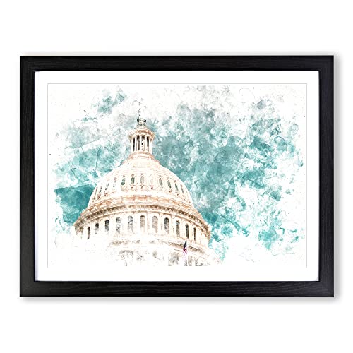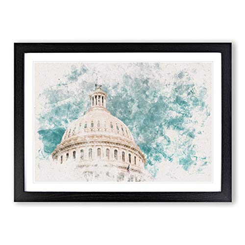Capitol Hill White House Watercolour Modern Framed Wall Art Print, Ready to Hang Picture for Living Room Bedroom Home Office Décor, Black A4 (34 x 25 cm)