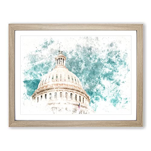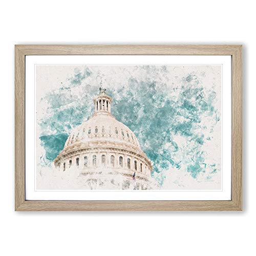 Capitol Hill White House Watercolour Modern Framed Wall Art Print, Ready to Hang Picture for Living Room Bedroom Home Office Décor, Oak A4 (34 x 25 cm)