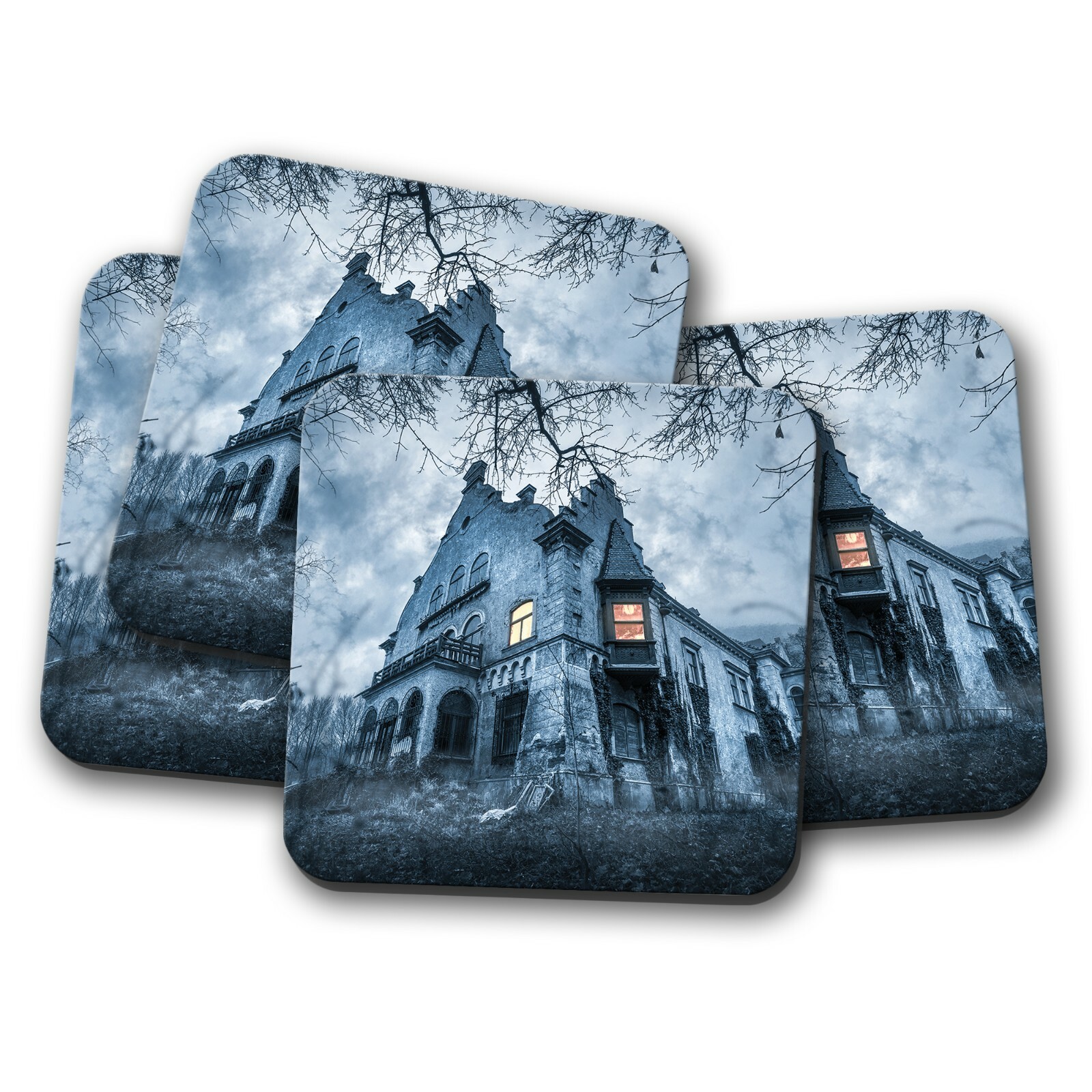 4 Set - Haunted Hill House Coaster - Halloween Scary Mansion Spooky Gift #16191