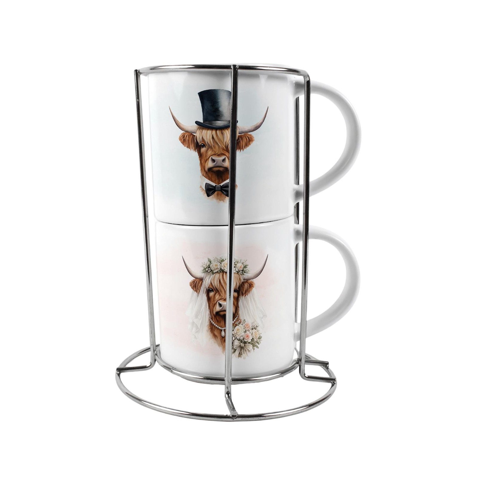 Highland Cow Wedding Stacking Mugs Set - His & Hers Novelty Couples Gift