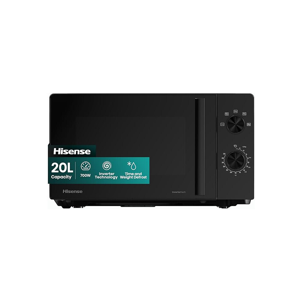 Hisense 700 Watts 20 Litre Inverter Microwave Oven H20MOBP1HIUK Black, Automatic Defrost, 5 power levels, Easy Clean, H24.1 x W43.4 x D32.9 cm Freesta