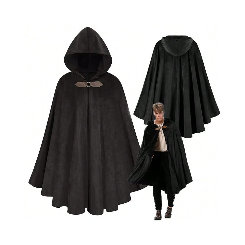 Halloween Cape With Hood Men's Robe, Hobbit Costume, Renaissance Hooded Cape, Black, One Size