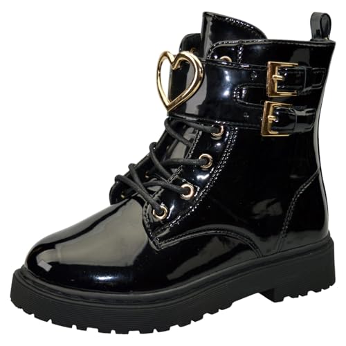 Girls Ankle Boots Kids Patent Lace Up Inside Zip Casual Walking Hiking Shoes Faux Leather (Black, One Size, UK Footwear Size System, Little Kid, Numeric, Medium, 11)