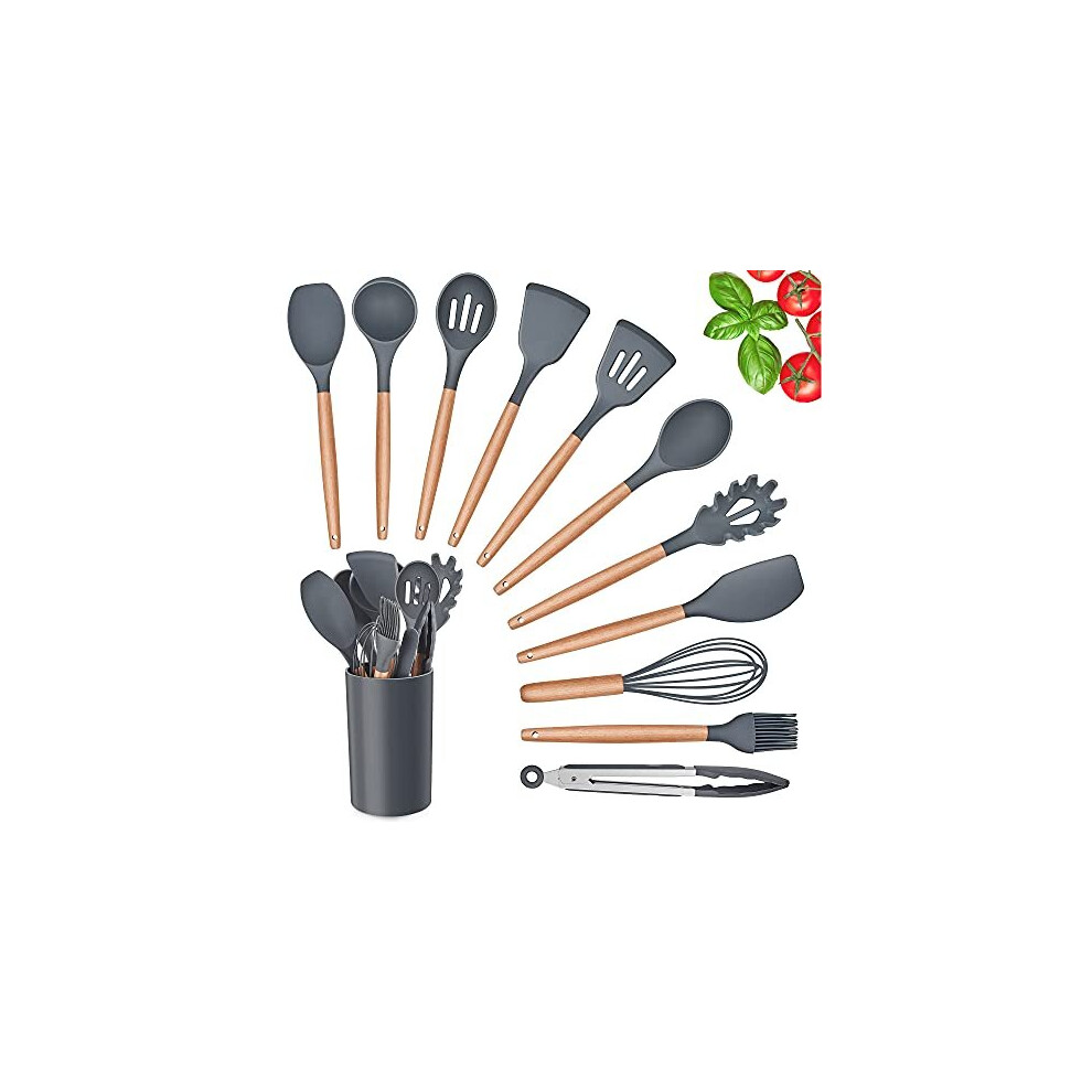 Silicone Kitchen Utensils Set with Holder 12 PCS Cooking Utensils Set with Wooden Handle Heat Resistant Kitchen Gadgets Utensil Set Kitchen