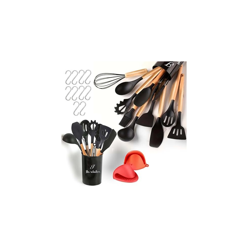 22 Pcs Black Silicon Kitchen Utensils Set with Holder-BPA Free Silicone Cooking Utensils Set for Non-Stick Pans-Heat Resistant Wooden Handle Silicone
