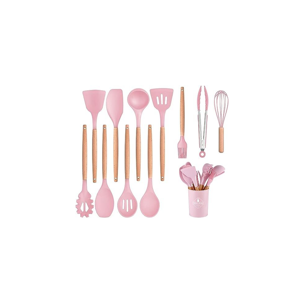 Herogo Kitchen Utensils Set, 12 Piece Silicone Utensil with Holder, Heat Resistant Cooking Utensils with Wooden Handle for Non Stick Cookware Pans, Silicone Kitchen Gadgets Tool Set, Pink