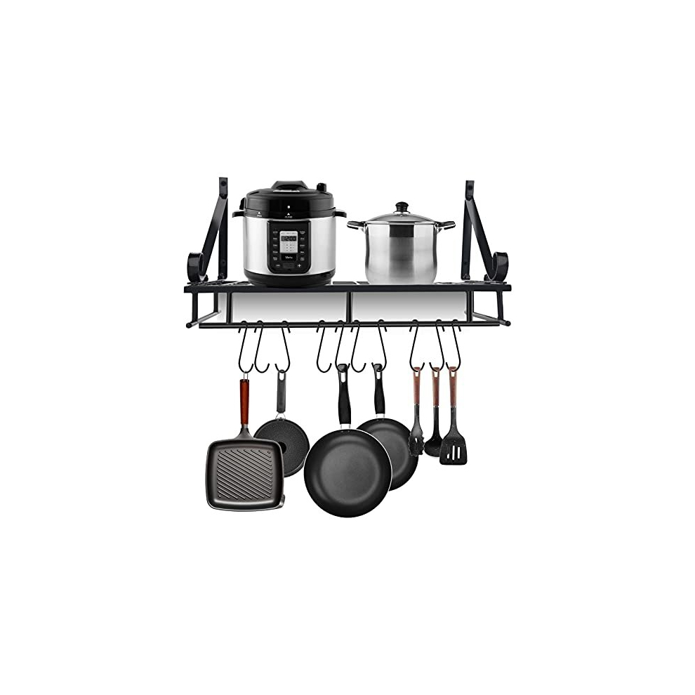 Metal Wall Mounted Pan Pot Rack, Hanging Kitchen Storage Organizer Kitchen Utensils Hanging Shelf with 10 Hook Holders 2 in 1 Antirust for Storing Pa