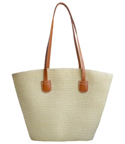 Faletony Summer Beach Bags Woven Bag for Women Straw Tote Bag Handbag Market Shopping Travel Holiday Shoulder Bag with Zip, Leather Handles Large Beige