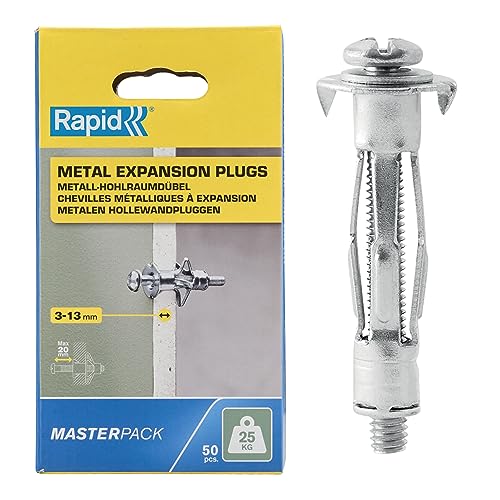 Rapid Hollow Wall Anchors, Pack of 50 Heavy Duty Metal Plasterboard Fixings for 3-13 mm Wall Thickness, 25 kg Load, Cavity Wall Fixings, Wall Plugs, Plasterboard & Chipboard Plugs (5001560)
