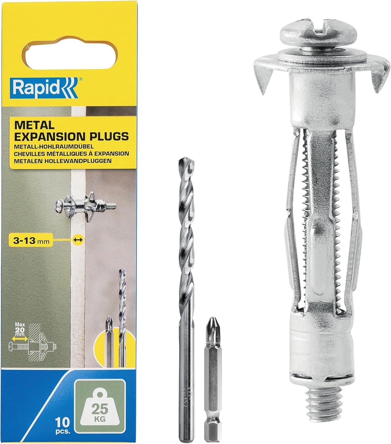 Rapid Hollow Wall Anchors, Pack of 10 Heavy Duty Metal Plasterboard Fixings for 3-13 mm Wall Thickness, 25 kg Load, Cavity Wall Fixings, Wall Plug, Plasterboard & Chipboard Plugs (5001546)