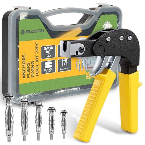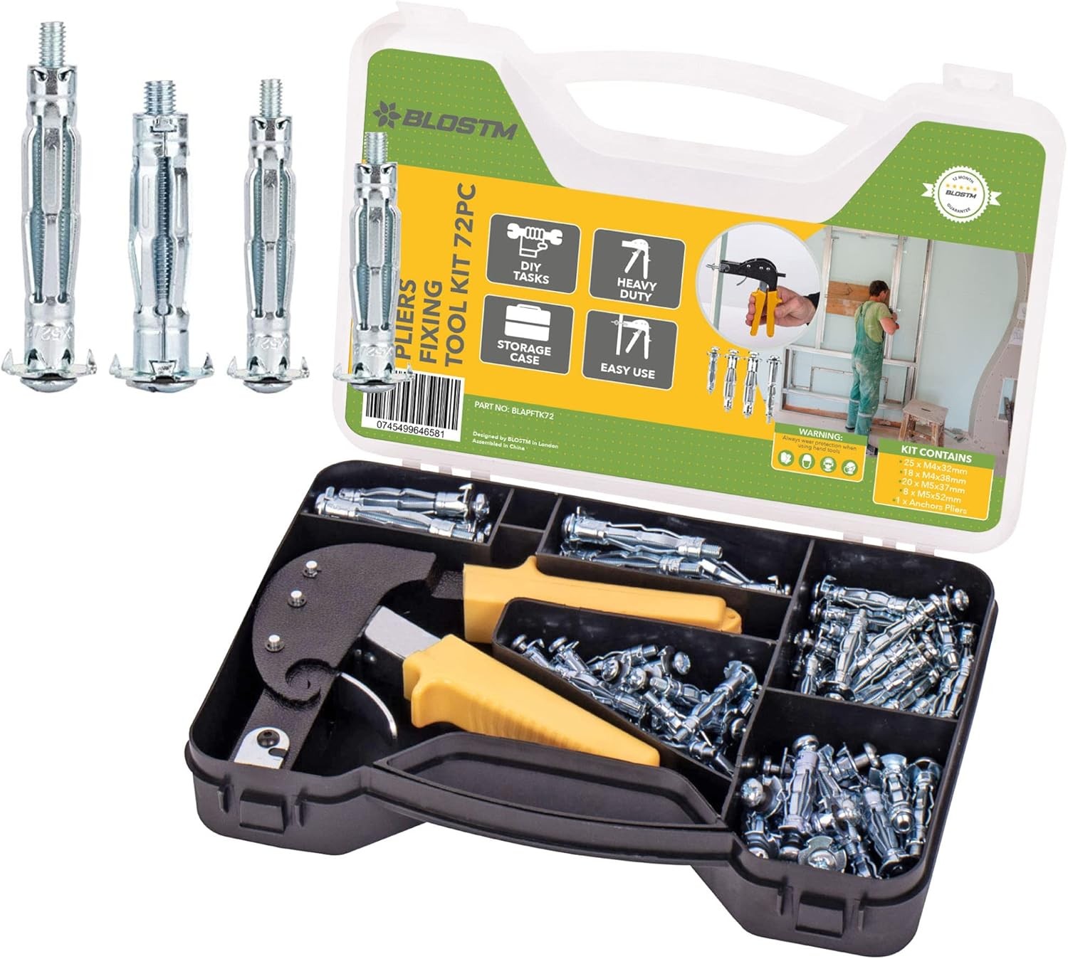 BLOSTM 72pc Hollow Wall Fixings - Heavy Duty Plasterboard & Anchor Setting Tool Rivet Gun Set with Carry Case Plaster Boarding