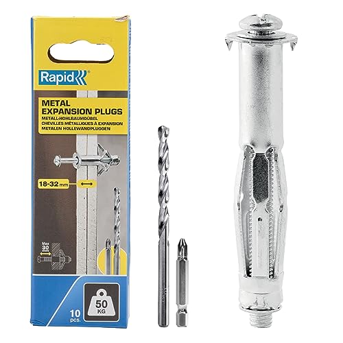 Rapid Hollow Wall Anchors, Pack of 10 Heavy Duty Metal Plasterboard Fixings for 18-32 mm Wall Thickness, 50 kg Load, Cavity Wall Fixings, Wall Plugs, Plasterboard & Chipboard Plugs (5001554)