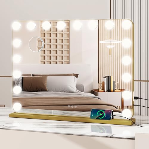FENCHILIN Vanity Mirror with Lights Bluetooh Speaker Hollywood Mirror with Lights 15 LED USB Charging Port 3 Color Modes Dimmable Touch Control 10x Magnifying