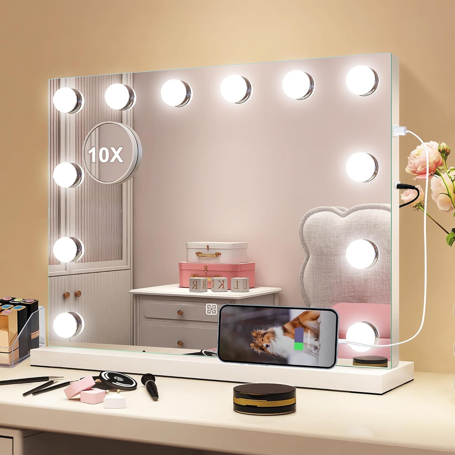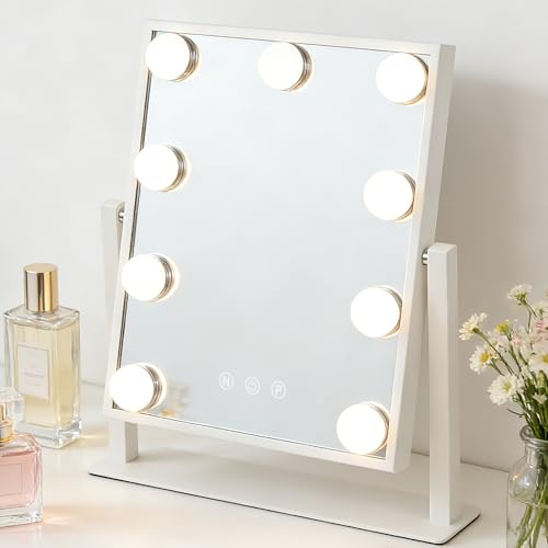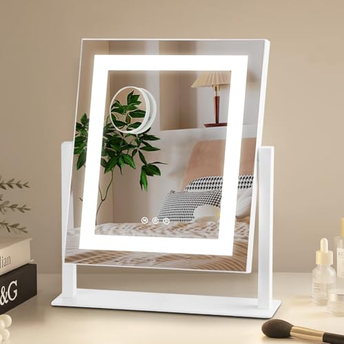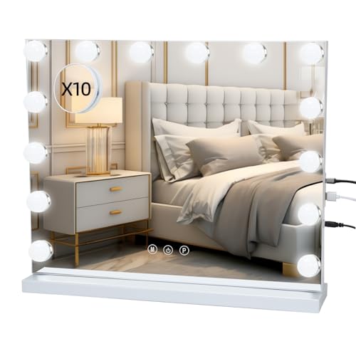 Hollywood Vanity Mirror with Lights, Lighted Makeup Mirror for Tabletop and Wall Mounted Hollywood Mirrors, Dimmable LED Bulbs & 3 Color Light Modes & 10X Magnifying Table Mirrors (White, Small)