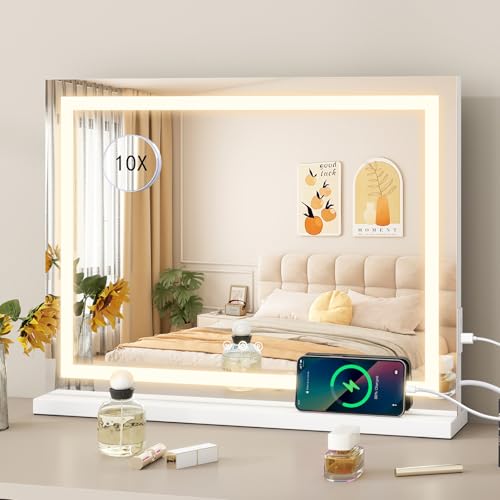 YOURLITE Hollywood Vanity Mirror with Lights, 58×46cm Lighted Makeup Mirror with Dimmable LED light, 3 Lighting Modes, Touch Control, USB+Type-C Charging Port, Tabletop and Wall Mounted