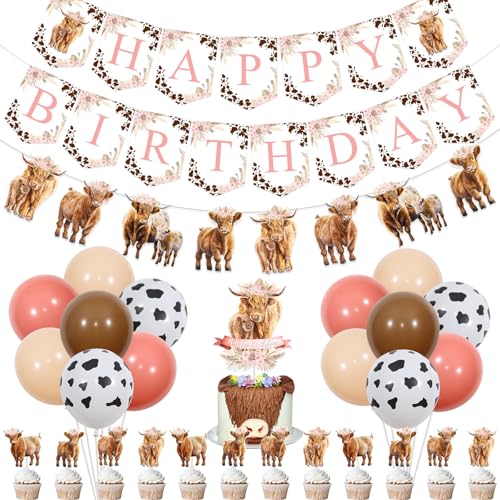 Jollyboom Highland Cow Birthday Decorations, Highland Cattle Happy Birthday Banner Garland Cake Cupcake Toppers Pink Brown Balloons for Farm Animal Retro Boho Floral Holy Cow Party Decor