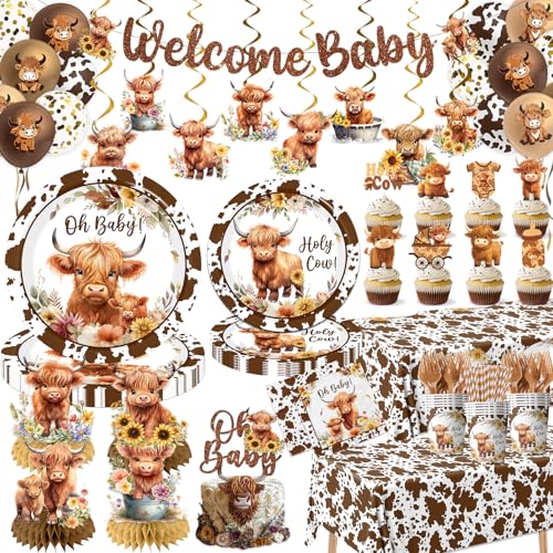 Highland Cow Party Supplies Holy Cow Highland Themed Baby Shower Party Decorations Tableware Plates Napkins Cups Cake Topper Balloons Western Cowboy Party Decor for Farmhouse Party Supplies 24 Guests