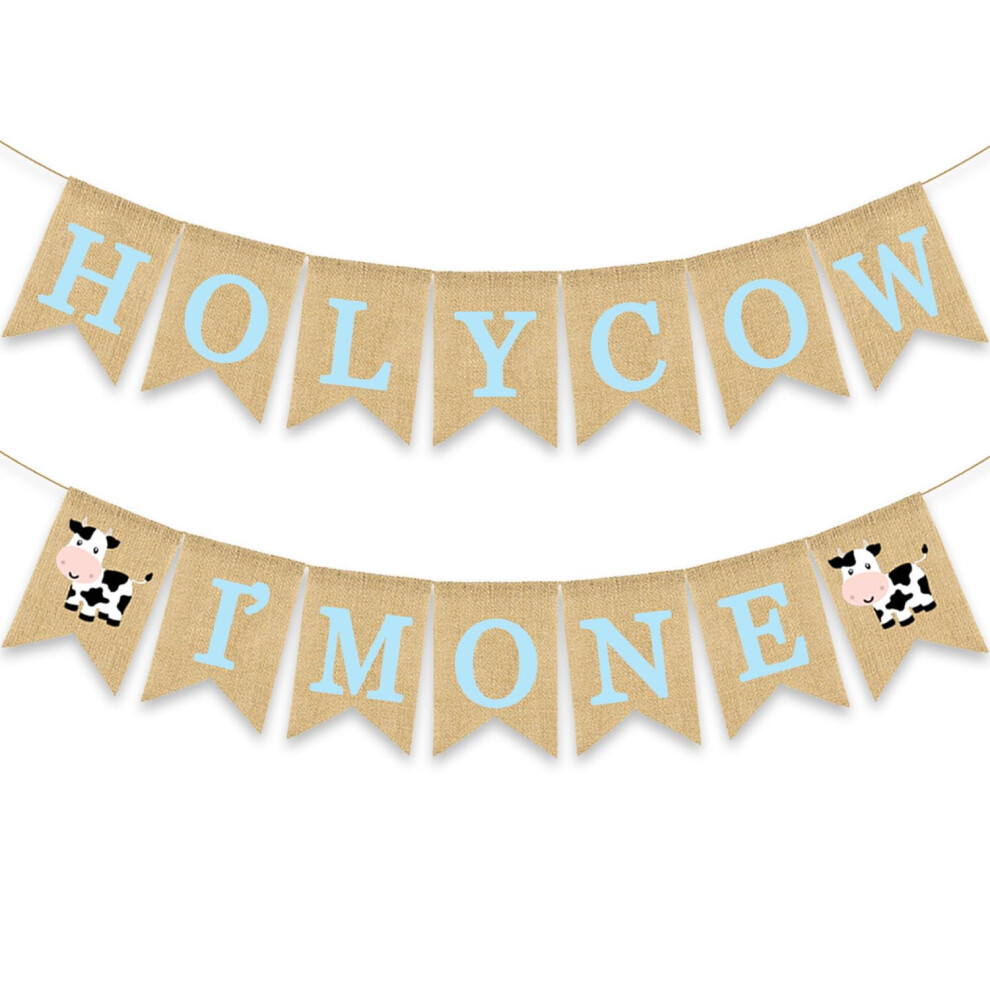 Gankbite Holy Cow I'm One Banner Farm 1st Birthday Party Decoration Barnyard Burlap Garlands Western Boy First Birthday Supplies Blue