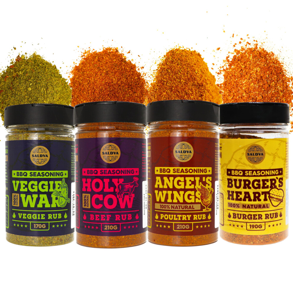 Universal Selection of Premium BBQ Seasonings - Holy Cow, Angel's Wings, Burger's Heart, Veggie War BBQ Rubs | Pack of 4 | 100% Natural | Spice Gift For Foodie
