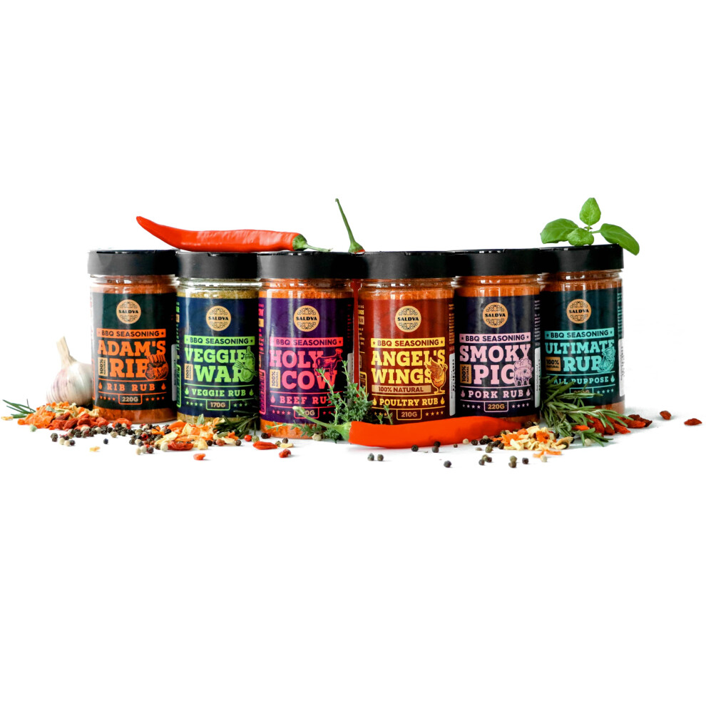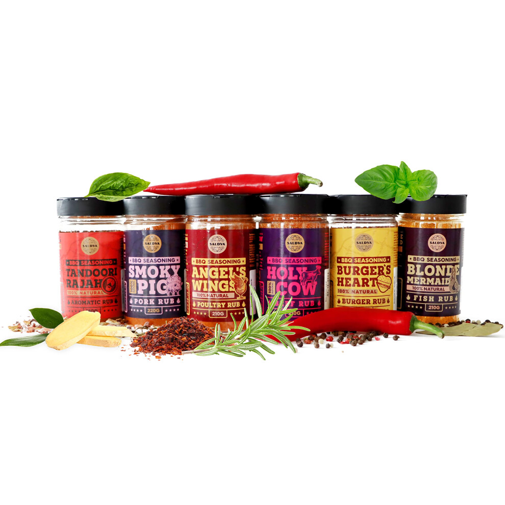 Gourmet Selection of Premium BBQ Seasonings - Holy Cow, Angel?s Wings, Smoky Pig, Tandoori Rajah, Burger's Heart & Blonde Mermaid BBQ Rubs | Pack of 6