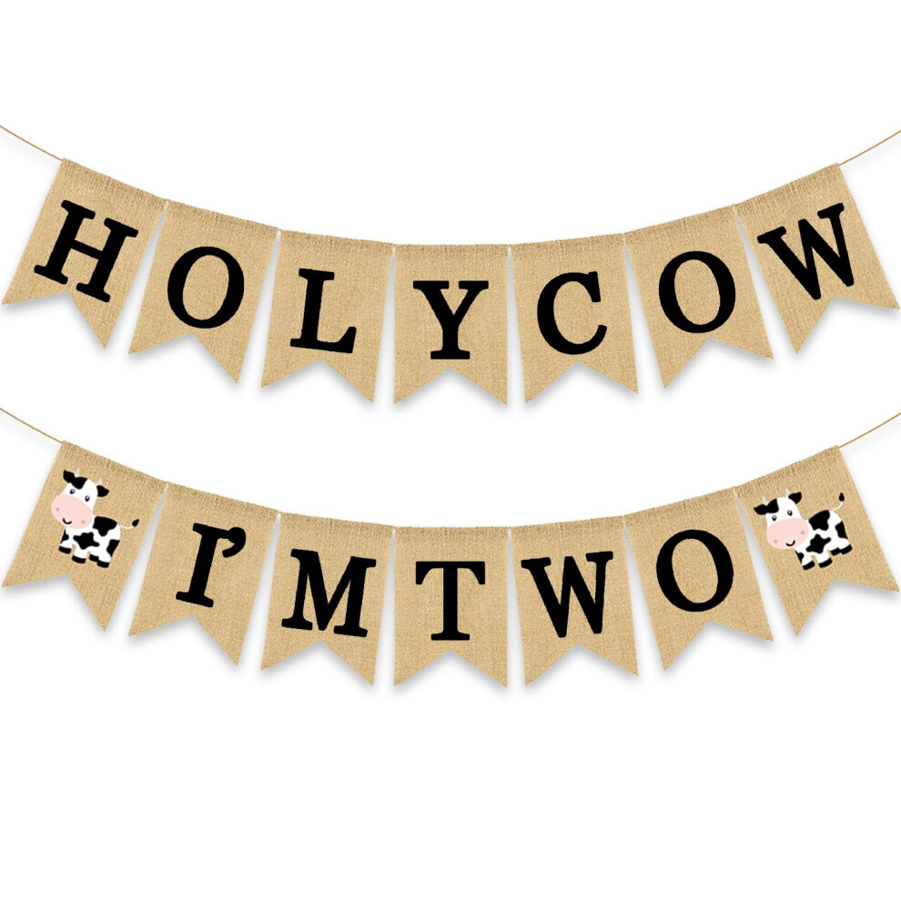 Holy Cow I'm Two Banner Farm 2nd Birthday Party Decoration Barnyard Burlap Garlands Western Boy Girl Second Birthday Supplies Black