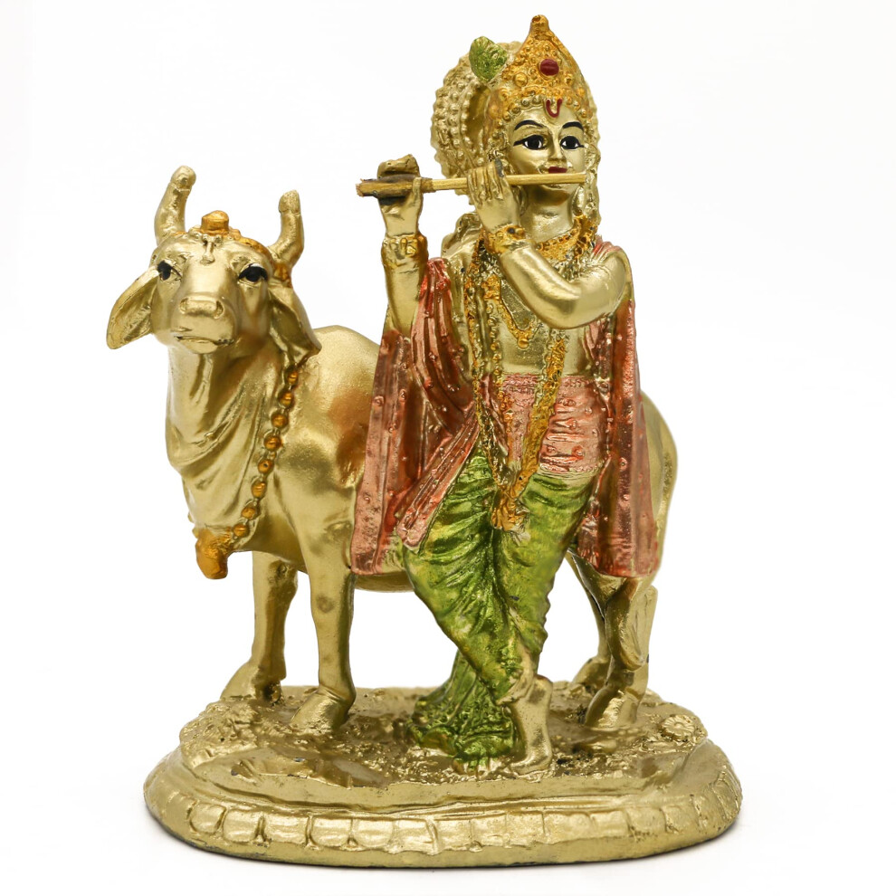 alikiki Hindu God Krishna Statue - 5.3 Inch Youth Krishna Idol and The Holy Cow Statue - Indian Buddha Statues Pooja Mandir for Home Yoga Room Decor