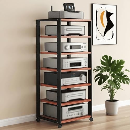 7 Tier AV Media Stand, Audio Rack Tower Stereo Components Cabinet, with Adjustable Wood Shelves, Home Theatre CD Record Player Stereo Receiver Equipment Rack, Load 550lbs(Red)