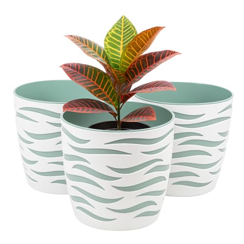Home Garden Ornaments Plant Pots Indoor Outdoor Decorative Plastic Flower Pots with Saucer, Olive Green Pattern – Set of 3, Indoor Plant Pot (19 cm / 7.5 inch)