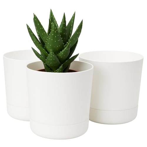 Home Garden Ornaments Plant Pots Indoor – Set of 3 Plastic Outdoor Planters with Drainage Holes and Saucer, Classy Decorative Flower Pots (17cm / 6.5inch – White)