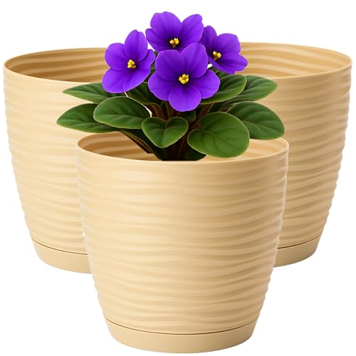 Home Garden Ornaments Plant Pots Indoor – Set of 3 Plastic Flower Pots, Unique Wave Design, No Drainage Holes, Indoor Plant Pot for Modern Home Décor (Beige, 15cm / 5.9 inch)