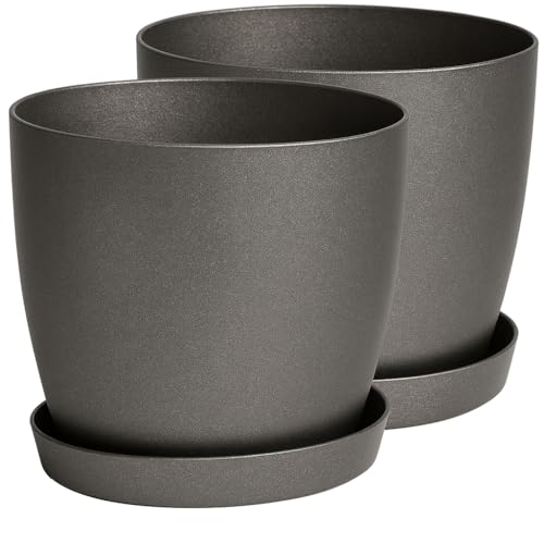 Home Garden Ornaments – Plant Pots Indoor, Set of 2 Plastic Outdoor Planters with Drainage & Saucer, Classy Flower Pots (15cm / 5.9 inch, Grey)