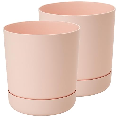Home Garden Ornaments – Plant Pots Indoor, Set of 2 Plastic Outdoor Planters with Drainage & Saucer, Classy Flower Pots (17cm / 6.7 inch, Pink)
